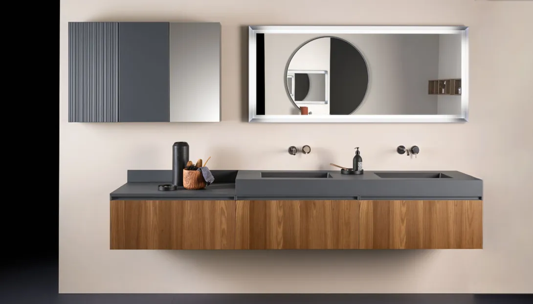 Großzügiges Badezimmer von Stocco mit langem, schwebendem Doppelwaschtisch in Grau, Holzabdeckung und wandmontierten Armaturen vor Spiegelfront..