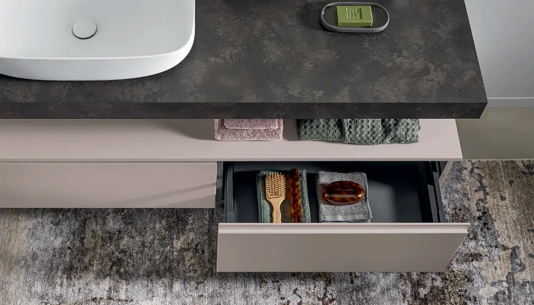 • Kombinierbar mit integrierten Becken, Aufsatzwaschbecken, offenen Elementen und Unterschränken